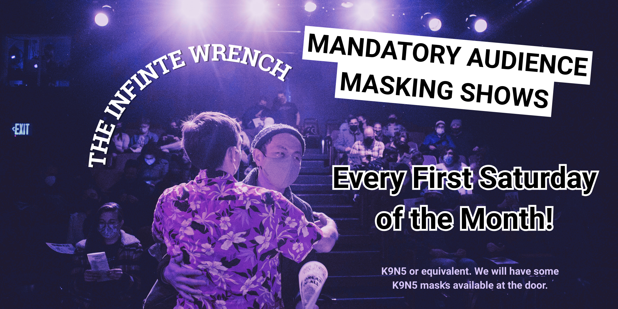 We care about everyone in our Bay Area community, so in the spirit of solidarity, we are pleased to offer monthly mask-mandatory performances of The Infinite Wrench on an ongoing basis! During these performances, we will require audience members to stay masked throughout the show. (We may invite select audience members to unmask for plays that involve audience participation.) On our end, we continue our practice of testing all performers weekly for COVID-19 to keep folks safer.
