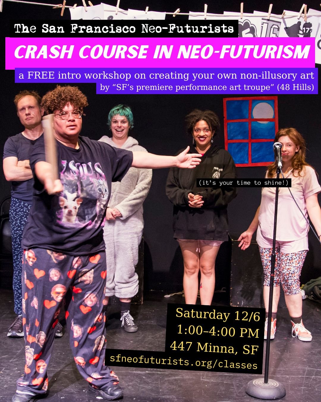 A three-hour workshop diving into the fundamentals of writing and performing short plays in the style of the San Francisco Neo-Futurists!